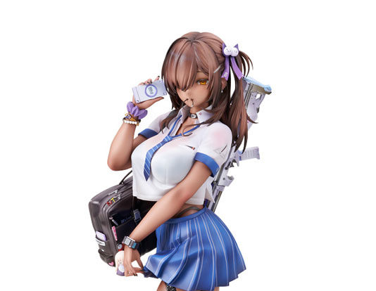 携帯を片手にすらりと立つ姿は抜群のプロポーションと相まって存在感溢れる仕上がり。スカートの端を摘む左手の繊細なニュアンスやヘアゴムを咥えた口元など、独特の情感を立体でお楽しみいただけます。塗装による衣装の透け表現をはじめ、美しい彩色も見所。各部の小物類やショットガンも造形・塗りともに精密に再現しました。表情は2種が再現可能。お好みに合わせたディスプレイをお楽しみいただけます。